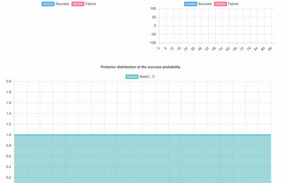 こちらが成果物。 Bayesian estimation of binomial distribution たとえば二項分布の実際の成功確率を 0.5 として 100 回試行を繰り返したとき、ベイズ推定により推定される成功確率 p の分布がどのように更新されるかを視覚的に理解できる。データが得られるたびに事後分布が少しずつ更新されて、0.5の近くに山が集中していく様子が観察できる。