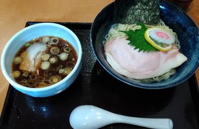 十日前にオープンの新店は近隣の行列店の二号店。 【第一京浜】に架かる歩道橋のたもとからちょっと入ったこの場所は嘗て『カシムラ』が在ったが、そののち何店か替わっているいるかしら。 店内は厨房を囲むL字型十一席のカウンター、二人掛けのテーブルが二卓。 11:35の入店で丁度満員に。その後食べ終わって出るまでの来客は六。 まだ知れ渡っていないせいか、タイミングさえ合えば並ばずに済みそう。 券売機は店の外…