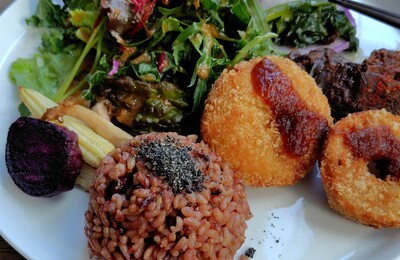 浜離宮恩賜庭園内の中島の御茶屋で和菓子と抹茶を予定していましたから、こちらのカフェでランチををいただきました。 https://share.google/1yfp6GJwHHd2A75CU 席だけ予定して、マグロと酵素玄米のサラダプレートをオーダーしました。 野菜が多くて食べ応えがありました。 ドリンクは自分が好きな時にドリンクバーでいれます。 ブラックコーヒーにしましたが、カップが大きく雑味が無…