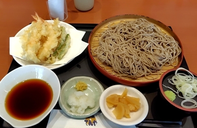 お目当てのラーメン店がまさかの満卓で,それならとこちらに。今回は初めてそばをいただいてみることにしました。カウンター上の端末を操作して,海老といかの上天ぷらと藪そば,そばは冷と温を選べるようになっていて,もり(冷)にしました。天ぷらですので気持ち少し待ちました。天ぷらは海老2,いか,れんこん,いんげんです。いただいてみれば,これまで天丼でいただいていたものに比べて,あたりまえですが,カラっとした感…