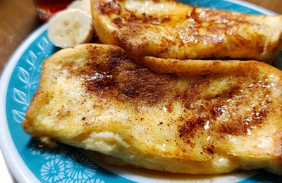 近所の某ドラッグストアは店内のBGMが大嫌いなので(笑)、家から6〜7kmのウエルシアに車で連れて行って貰って帰って来たところ。 今日は消費期限2日過ぎた食パン4枚を消費するために「晩ご飯はフレンチトーストだよー」と予告しておいた。 ↓昨日の今日でバナナ添えてるし。でも昨日より熟してたお陰か胃は痛まなかったな。 どうせ後からいっぱいメープルシロップをかけるので卵と牛乳には甘味を加えず、いつもバニラ…