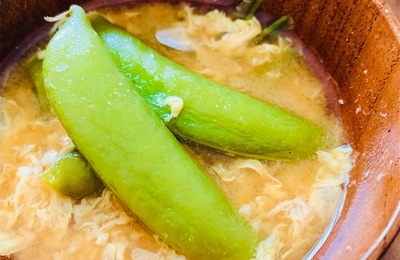 『スナップエンドウとふんわり卵のお味噌汁』 スナップエンドウがもつ甘さ、優しいふわふわ卵が味噌の程よい塩分とベストマッチします! お味噌の量は体調などによって調整を! <材料(2人分)> スナップエンドウ 80g卵 1個水 400ml味噌 大さじ3〜4 <作り方> ①スナップエンドウのヘタをポキっと折り、ヘタと本体が筋で繋がった状態でヘタを下の方にゆっくり引っ張って筋を取ります ②今度は上記1と反…