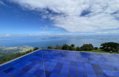 <夏編> 去年の8月、あまりにも暑い京都から逃げたくて、ロープウェイに乗って、「びわ湖バレイ」に行きました。 山頂のひまわり モンシロチョウ(たぶん)が迎えてくれました。 さて、第一の目的地「びわ湖テラス」です。 ここには水盤があって、その向こうにびわ湖の景色が眺められるようになっています。 水盤からのびわ湖の風景は絶景です。 この日はいいお天気だったので、青いびわ湖と空が一体化していました♪ こ…