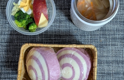 一行日記 今朝の断捨離、携帯の使わないアプリを削除しすっきり 今日のおべんとう 11月10日 おべんとう 知人の挑戦 製造販売を始めた紫芋の蒸しパンのおべんとう
