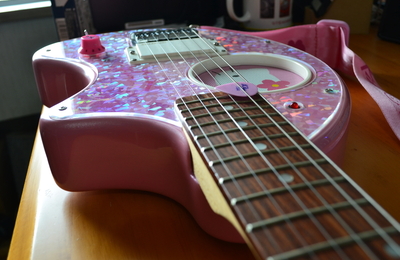 2000年頃に発売されたキティちゃんのZO-3(ミニギター)です。 購入したのも2000年頃。キティラー第1世代の嫁ちゃんが欲しいと言ったので買いました(多分)。 でも彼女はキティが好きなだけで楽器に興味はありませんから弾くつもりも全くなし。 その後、結局ワタシが管理しています。年に数回引っ張り出して弾いてみたりという状況。 ZO-3ですからアンプは内蔵。でも9Vの四角い電池が必要です。 スピーカ…
