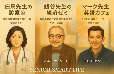 Senior Smart Life 下の3つのコーナーからお選びください。 白鳥先生の診察室 季節の病気や養生法をやさしく解説。 このコーナーへ 銭谷先生の経済ゼミ お金の基本から投資の実践まで、やさしく解説。 このコーナーへ マーク先生の英語カフェ やさしい英語ニュースと世界の話題。 このコーナーへ 🏠 ホームへ戻る