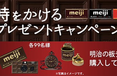 明治時をかけるプレゼントキャンペーン 賞品 【令和賞】対象商品5つ以上購入FMラジオ付レトロスピーカー/9名 【大正賞】対象商品3つ以上購入懐中時計/99名 【昭和賞】対象商品3つ以上購入オルゴール/99名 【平成賞】対象商品3つ以上購入写ルンです™/99名 応募方法 キャンペーンサイトへアクセスし「レシートで応募する」ボタンをタップキャンペーン期間中に株式会社 明治の板チョコレートを希望コース分…