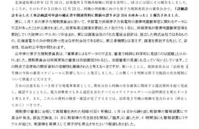 北海道電力株式会社 泊発電所の稼働に反対する株主の会が、事業者 他起動電力株式会社に対し、調査資料の見直しを完了し終わるまでは稼働しない(停止しておく)ことを求める要望書を提出しました。(2月14日付)