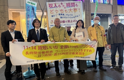 11・14「時短いいね」全国いっせいアクション 元町商店街東口で兵庫労連が宣伝 過労死防止と“時間のゆとり”ある働き方を訴え 全労連が呼びかける「11・14 時短いいね 全国いっせいアクション」に合わせ、兵庫労連は11月14日(木)18時から、神戸・元町商店街東口で夕方宣伝を実施しました。11月が「過労死等防止啓発月間」であることを踏まえ、長時間労働の是正、過労死をなくす社会づくりを強く呼びかけま…