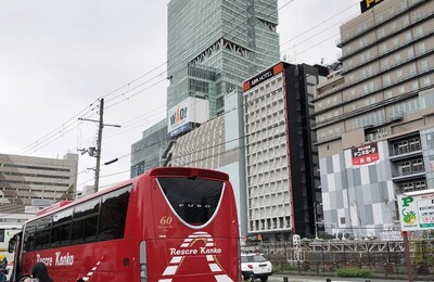 20 .ハルカスとレスクルバス イタリア館の至宝を観賞し終えて集合場所へ戻ってくると雨が降り出していた。 ネットで確かめると数十分は降るようです。 ショップで時間を過ごして小雨になったころバスまで急ぎました。 私たちの乗る赤いレスクルバスは天王寺公園出口近辺で待っていてくれました。 丁度あべのハルカスをバックにカメラに収めました。 大阪・関西万博の感動を再び・・・。 「イタリア館の至宝 鑑賞とマリ…