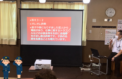 まごころ和民家カフェを開催しました!9/18(木) 今回のまごころ和民家カフェも内容盛り沢山となっております! 1,「特殊詐欺防止講習会」 2,まごころ演芸「かわいいベイビー・珍島物語」 3,「みんなで体操」 4,「笑いヨガ」~女刑事編~ 5,「最後に」 1,「特殊詐欺防止講習会」 今回の和民家カフェまごころでは田川市警察署の方に「特殊詐欺」について講義をしていただきました。近年の詐欺は多種多様化…