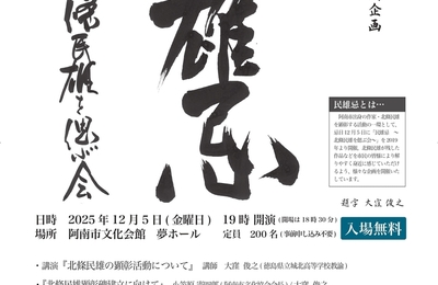 民雄忌 19:00 阿南市文化会館夢ホール 講演 「北條民雄の顕彰活動について」大窪俊之 「北條民雄顕彰碑建立に向けて」小笠原憲四郎(阿南市文化協会会長)/大窪俊之 入場無料 12月5日 民雄忌
