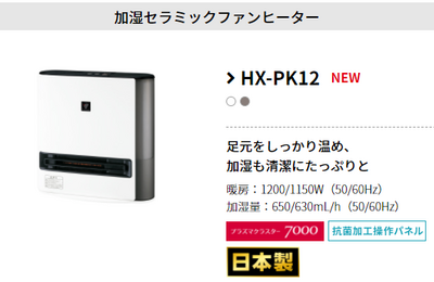 HX-PK12とHX-L120の違いを比較 HX-PK12は業界トップクラスの加湿量650mL/h HX-PK12はHX-L120と比較して風量30%がアップ HX-PK12はHX-L120と比較して温風到達距離が2倍 「大風量暖房」+「たっぷり加湿」で、高まる体感温度 HX-PK12がおすすめな方 HX-L120がおすすめな方 HX-PK12とHX-L120に共通する機能 シャープ独自の空気清浄…