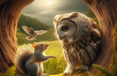 ちいさな仔リスとミミズクのおじさん さっきまであんなに晴れていたのに、急に空が暗くなってきました。 たったひとりで、はじめての場所へやってきたちいさな仔リスは空を見上げました。 「やあ、これはひと雨どころか、もっとすごい雨がきそうだ。そうとくれば、ぽくはもうおうちへ急いで帰らなくっちゃ。せっかくこの場所をもっと探検したかったのになぁ。」 はじめて訪れたこの場所には仔リス以外にだれもいないようでした…