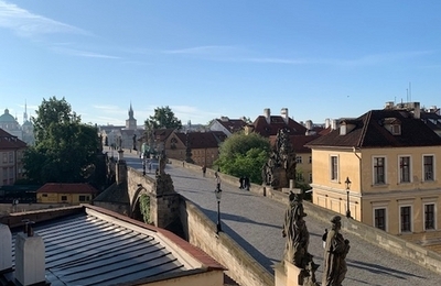 ウィーンでの昨年の残務をこなすかたわら、1週間の休みをとって隣国チェコのプラハへ。 Robert さんからは「プラハは、古き良き時代のウィーンが残っているよ!」と嬉しい助言を頂き、とても楽しみな初プラハとなっている。 プラハについてあいにくの天気が続いていたが、今朝は快晴♪♪♪ プラハと言えば、カレル橋。 橋のたもとの小さい宿からの窓風景は、まさにそのカレル橋。 久々の青空、目の前カレル橋、朝食前…