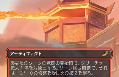 基本データ 火の国の砲台 (2)(赤) アーティファクト 自分のターンの戦闘の開始時に、クリーチャー最大1体を対象とする。ターン終了時まで、それは+2/+0の修正を受け火の技2を得る。 (赤): このアーティファクトの上に蓄積カウンター1個を置く。 このアーティファクトの上から蓄積カウンター50個を取り除く:1つを対象とする。これはそれに50点のダメージを与える。 アバター 伝説の少年アン エター…
