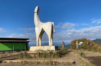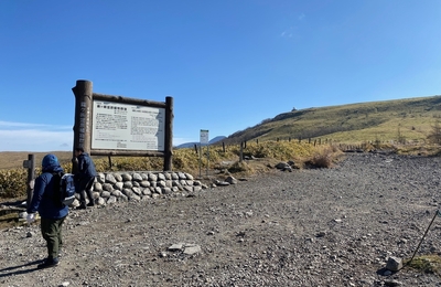 今回は、車山高原で半日ハイキングをして、日没前に帰途に就く計画です。半日プランですから、ビーナスラインの途中にある車山肩・駐車場(収容:180台)にクルマを駐めて、車山山頂(1925m)をめざすことにしました。下車すると思ったより寒くて、同行の妻からユニクロのウルトラライトダウンジャケットを借りました。体感温度は4~5℃前後、インナーにフリースだけでは明らかに防寒対策不足、ニット帽や手袋も持参すべ…
