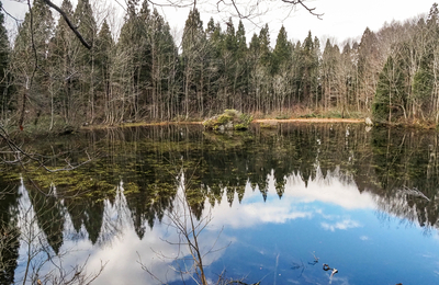 甑コルから 男甑山・女甑山へと往復してきて、今度は名勝沼の方へ。ところが・・・ちょっと下った先からは、日陰になりやすい谷地形。濡れた落ち葉と雪で滑る なかなかの急斜面。 足の置き場を探りながら、一歩一歩下って行く。