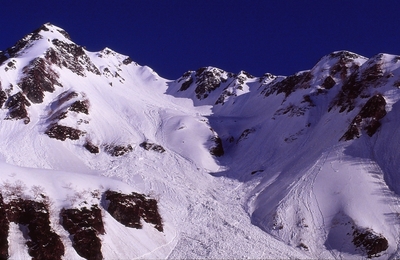 涸沢から見た北穂、北穂沢が雪崩だらけです 悪天で停滞し天気が良くなったら奥穂に登り、北穂にも登ったが雪崩で困ったこの山行、そろそろ下山の日となりました。 下山日に限って快晴というのは大昔のこの頃からよくあるパターンのようです。 それで涸沢のまわりの山の写真を一通り撮っていたのでドウゾ。 どこもかしこも雪崩だらけですが、特に北穂はこれ以上崩れるところがあるのか?と思うくらい雪崩が起きていたのでした。…