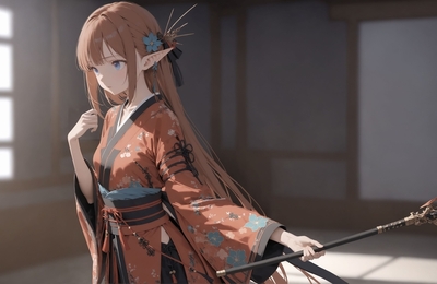 やわらかな朝の光が、木枠の窓から静かに差し込んでいた。畳まれた影が床に伸び、空気にはまだ夜の冷えがわずかに残っている。その部屋の中央に、ひとりのエルフの少女が立っていた。 長い赤茶の髪は背中に流れ、花の簪と青い飾りが耳元でかすかに揺れる。着ているのは、古い様式の和装――だが人の国のものとは少し違い、布には精霊文字が織り込まれていた。彼女の名はサイネ。エルフでありながら、森ではなく「人の里」で育った…