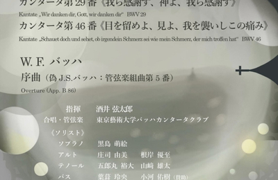 2月21日(土)東京藝術大学バッハカンタータクラブ 東京藝術大学奏楽堂 【曲目】 1.バッハ/カンタータ第46番「目を留めよ、見よ、我を襲いしこの痛み」BWV46A:根岸優至/T:五郎丸裕大/B:小河佑樹 2.W.F.バッハ/序曲(偽J.S.バッハ/管弦楽組曲第5番) 3.バッハ/カンタータ 第29番「我ら感謝す、神よ、我ら感謝す」BWV29S:黒島萌絵/A:庄司由美/T:山崎雄太/B:葉葦玲央【…