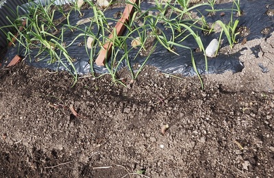 孫が帰って行ったこの日、菜園に来ました。 菜園の端に植わっているのは、ニンニクです。 嘉定種といって暖地向けの早生品種。30㎝ほどに育っていました。 真ん中に、レンガ片があります。 右か左、どちらかを深植えにしましたが、どちらなのか記憶が・・・。 実はこの時期、やることがあって。 それは、追肥です。 専用の肥料を、 こんな感じで、マルチの穴に少しずつ入れていきました。 追肥をしたあと、よく見たら、…