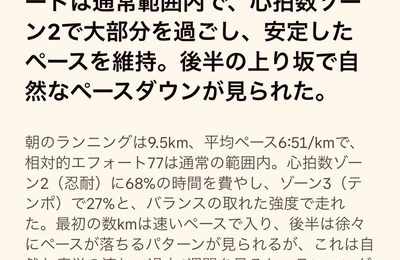 StravaのAI 1ヵ月間無料でStravaのプレミアム会員を試す機会があったので、AIによるランの評価を受けてみた。よくみると、StravaのAIはArtifical IntelligenceではなくてAthlete Intelligenceになっている。一般のAIとどう違うのかわからないけど、スポーツに特化した人工知能かもしれない。 ランのペースは次のようにあまり良くない でもAIはこんな回…