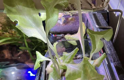 44日目の水槽レタスです。順調に育ち始めたのですが、なぜか徒長(?)し始めました。