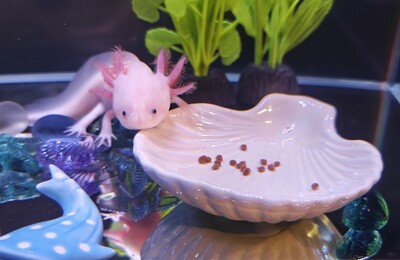 ウパちゃんがわが家にやってきてから約ひと月半、7cmだった体長は16cmになり、そろそろ人工飼料のサイズも大きくしようかなという位になった。いつもエサを与える時には水槽内のお皿の上にパラパラと撒き、そこからスポイトで吸い取って顔の近くまで持っていくのだが、タイミングが悪いと水槽内のガラス石(アクセサリー)のあたりに落ちてしまう場合がある。 するとウパちゃんが石を小突いたりする事があり、ウパちゃんが…