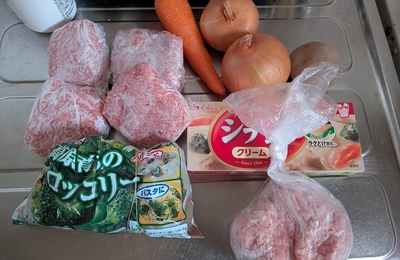 夕飯は この材料で シチュー ハンバーグ を作りました(ブロッコリーは食べる直前に入れます) あと、豆腐と味噌汁作りました。 次男が仕事から帰って来るのが早いので(さっき帰ってきて入浴中) 早めに作り、早めに食べ寝る😥 ので早めに夕飯の支度。 いつもは朝、出勤前に次男の夕飯だけ作り冷蔵庫に入れて置いてます。 野菜少ないけど、まあいいか😅