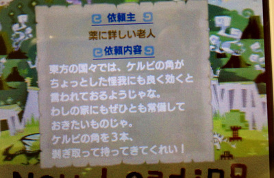 モンハンクロスだとゲーム内のロード画面に出てるからね クエストが始まる時の画面↓ このクエの場合は「爺さんのためにモンスターの角を取ってくる」っていう事だ こんな感じでどのクエにもモンスターを狩ったりするための理由が設定されていて クエ開始時のロード画面に出てくるから それ読めば「どうして敵を倒すのか」っていう設定はわかるっしょ~ なんて思いながら 改めてクエ依頼内容を見ていた 迷惑してるから助け…