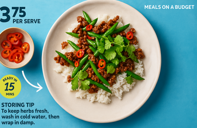 CHILLI STIR-FRY 豚ひき肉といんげんのピリ辛炒め わずか15分で完成!本格アジアン 準備5分、加熱10分。忙しい日の夕食に最適な、ホイシンソースが効いた旨辛レシピです。 準備 5分 加熱 10分 分量 4人分 🛒 材料 (4人分) 豚赤身ひき肉 500g いんげん豆 400g ホイシンソース 1/3カップ にんにく / 潰す 2かけ コリアンダー (パクチー) 1/2束 ピーナッツオ…