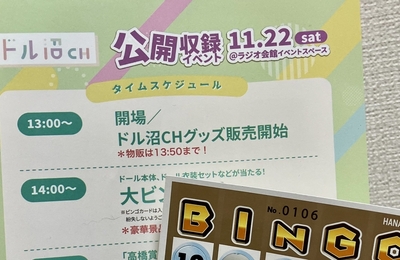 ドル沼!公開収録だぞ〜!!! 朝からもっさりもっさり準備して…いざ!ドル沼公録イベントへ!!! 新幹線でビュンと東京着して無事にたどり着きましたよ、ラジオ会館。 目次 会場到着とビンゴ大会 公開収録開始 オーナー様の1分プレゼン HANIたやとADVillageドールへの愛 会場到着とビンゴ大会 とりあえず20分ぐらいに会場着したので受付済ませて中に入るともう皆様沢山集まってらして……物販並ばれて…