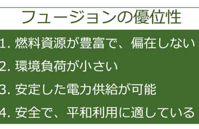 上の表は、フュージョン(核融合発電)が他の発電方式に対して持つ優位性をまとめたものです。ここでは、それらを一つずつ解説していきます。 1. 燃料資源が豊富で、偏在しない まず、フュージョンの第1世代として想定されているD-T反応について述べます。 燃料のひとつである重水素(D)は、水素原子核(陽子1個)に中性子が1個結合し、質量が2倍になったものです。「二重水素」の「二」を省略して、一般に重水素と…