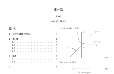 こんばんは。今日もノートの投稿をします。今週末は何をして過ごそうか悩んでいる木曜日の夜です。みなさんは今週末は何をして過ごすか決まっていますか?よかったらのんびりとScienceHub(サイエンスハブ)に投稿してあるノートを読んで数学や物理の勉強をして過ごすのもいいかもですね。 sciencehub.tk-labo.com 今日は少しあまりなじみのないものを取り上げてみます。連分数というものです。…