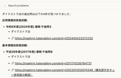 はじめに 情報処理技術者試験の過去問を解いて、Pythonで実装するのは楽しいのですが、「あれ、ダイクストラ法ってどの年度で出題されたっけ?」と思ったときに、いちいちブログを検索するのが面倒でした。 そこで、Anthropicが公開しているMCP (Model Context Protocol) を使って、Claudeから直接過去問データベースを検索できるようにしてみました。 MCPとは MCPは…
