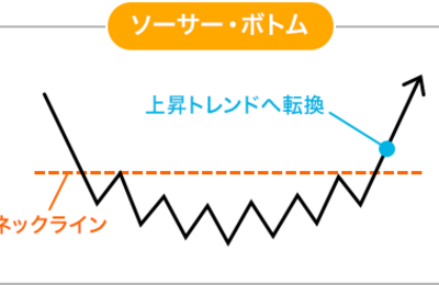 ソーサー・ボトムとは転換型のチャートパターンであり、下降トレンドの終わりを分析します。安値圏である程度上下に行ったり来たりする揉み合いが発生し、その形が受け皿のようになることが特徴的です。 またネックラインも重要なポイントです。ソーサー・ボトムのような形が発生しても、ネックラインを上回らなければ完成ではありません。価格がネックラインを上回ったときにソーサー・ボトムが完成となり、下降トレンドが終わっ…