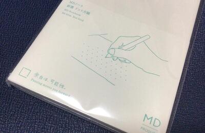 MDノート 新書 ドット方眼 よく行く文具店で、MDノートのコーナーをなんとなくみていたら、ドット方眼がA5以外でも発売されているのを発見! 文庫とA5は、まだ無罫と方眼のストックがあるので、まずは新書を購入してみました。 新書はバイブルサイズよりちょっとだけ大きいので、これをぴったりサイズの革カバーにいれるとシステム手帳風でカッコイイのです。 A5のものしか見たことなかったので、新鮮でもあります…