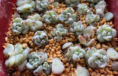 昨年、チマチマ植えがしたくなって購入した『ペレスデラロサエ』 淡い色合いやこぢんまりしたフォルムがとてもかわいい。 チマチマ植えに使った後、植え替えをして屋外で育てていましたが、1月に入ってからは屋内に。 複数鉢持ってれば、屋外で冬越しできるか試すことも出来たのですが、ひと鉢しかないので、賭けは出来ないなと、屋内管理。 南向きの窓際に置いていたのですが、何故か茎や葉の付け根から、根が沢山出てきた。…