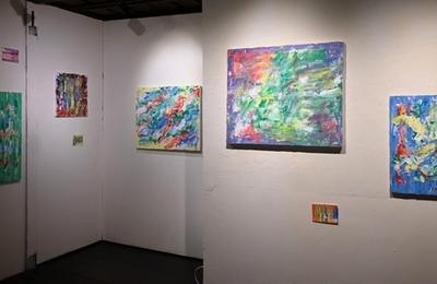 2024年6月にゴルディロックスで2人展を開いて以降、矢継ぎ早に展示をしているHIRATA さん。ペインティングナイフを駆使した油彩の抽象絵画を、高さをそろえずに展示しています。 30号以内の板やカンバスに描いた18点と、ポストカード大の紙片に描いた9点。いずれも題はついていません。「紙に描くのはダメらしいんですが、せっかくあったので…」とヒラタさん。 前の絵の具が乾ききらないうちに原色を重ねてい…