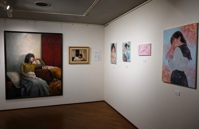 (承前) 7カ所目はビストロカフェ+ギャラリー・オマージュ(中央区南1西5 プレジデント松井100ビル)で上野琴音×竹内優希 二人展「見つける光、その影」。 2人とも札幌大谷大2年生で、第98回道展で新人賞を受賞した若手の実力者です。 左は上野さん「余韻のかげに」。画面上方を大きくあけた構図で、人物のまわりの空間を際立たせています。 竹内優希さんは「未完の大器」展の常連で、ギャラリーエッセでも見た…