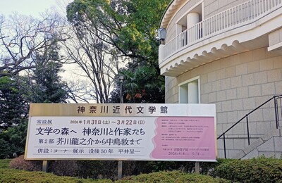 只今、神奈川近代文学館では「文学の森 神奈川と作家たち 第二部 芥川龍之介から中島敦まで」展開催中です。 本展は本館の冬季常設展の第2部。 芥川龍之介の衝撃的な自死に始まった激動の時代の文学を、13人の作家たちを中心に紹介しています。 新収蔵資料である中原中也の詩稿「月」「黄昏」の展示も。 刊行前の『山羊の歌』収録の詩を、雑誌「日本歌人」のために書き写して送ったと考えられる原稿です。 同時開催は「…