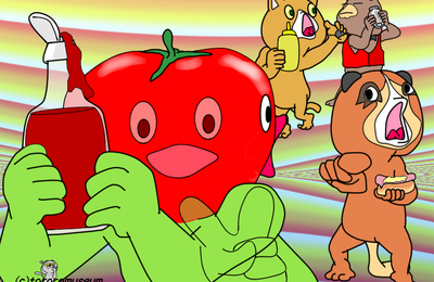 おーい! ポモドーロ! ケチャップくれよぉ!! えっ!? やだよぉ あげねーよぉ マスターはくれたぞ おまえ 画面いっぱいupで けち臭いこと やってんじゃねーよ! とまとケチup マスター奴