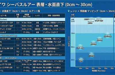 ダイワ製のシーバスルアーって、僕は大好きでよく投げるんですが、種類が多すぎてどのルアーがどのくらいのレンジを狙えるのか忘れてしまいがちです。 そこでこの記事では、個人的備忘も兼ねてダイワ製シーバスルアーの飛距離とレンジを網羅した早見表(一覧表)を公開します。ぜひ参考にしてみてください。 1. 【一覧表】ダイワ製シーバスルアーのレンジ&飛距離早見表 1-1. 超表層・水面直下領域(0cm ~ 30c…