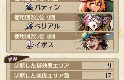 星間の塔25Fまで制限プレイをした後、縛りなしで26~35Fをクリアした際の記録を含めた「戦闘でメギドを選出した回数(使用回数)」の記録です。