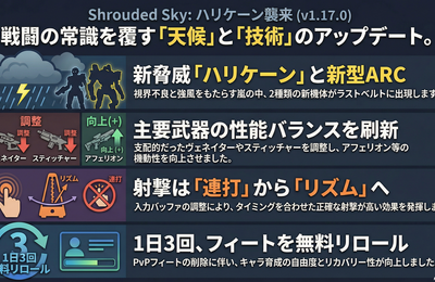 Shrouded Sky - パッチノート 1.17.0 | アークレイダース ポイント3行 新マップコンディション「台風」が追加。風による移動速度変化、飛来瓦礫によるシールド浸食、視界不良など、レイドの戦略が根本から変わる 新ARC敵「ファイアフライ」「コメット」が登場し、スティッチャー・ケトル・ヴェネイターのナーフを含む大規模武器バランス調整が実施 気象観測システムプロジェクト、無料レイダーデ…