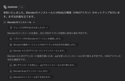 実体験レポ。笑撃。ブレンダーをインストールするAI。ノートパソコンを所有している人も必見 Manusとは大手企業が買収した事で話題になった自律型エージェントAIである。 マナス「俺はレアだぜ」 よくわからんし 平然とした顔でエラーを修正してvrmを出力してくるマナスさん、怖すぎるだろ。自律型エージェントの最大の欠点は無限ループだが、今回は突破できたようだ。 エラーになると、Pythonスクリプトを…