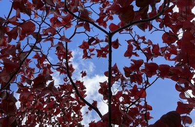 朝晩冷えるようになって、一気に紅葉が進みました! 一番手は、ハナミズキ♪ 赤いです。かえでは、枝先から色が変わって行って、裾模様。 京都御苑は錦模様の織物みたいになっていきます。 海外の方達も嬉しそう。