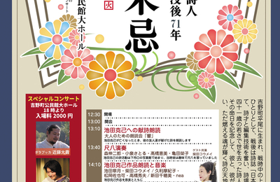 今日は2月13日、池田克己の命日です。 池田克己は、1953年2月13日に亡くなりました。金曜日でした。 13日は平日なので、必ず休日になる祝日に「未来忌」を行いました。 未来忌チラシ どうしたら池田克己という詩人の素晴らしさが伝わるだろうと考えて、考えすぎて、こんなにもりだくさんになってしまいました。 プログラム原稿 馬上侯チラシ 会場のうしろには、奈良大学の木田隆文教授からいただいたパネルと、…