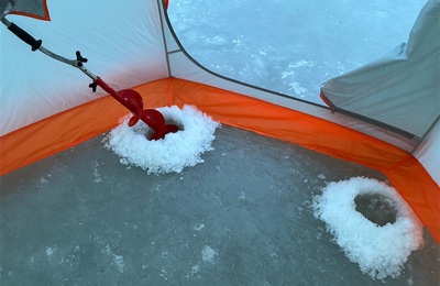 前回投稿の【氷上コマイ釣り】の続きです 前日はコマイ5匹と惨敗 せめて10匹は欲しかった😢 翌日もコマイ狙いで出撃 06:00 前日と同じポイントに入るが 100mほど左にずれた場所にテントを張る しかし…前日と違い風が強い 1人で来てる氷上釣り初心者の宗君は テントを張るのに苦労する😰 30分ほど四苦八苦してると隣のオジサンが 手伝ってくれてようやくテント設置完了 手助けしてくれたオジサンに御礼…